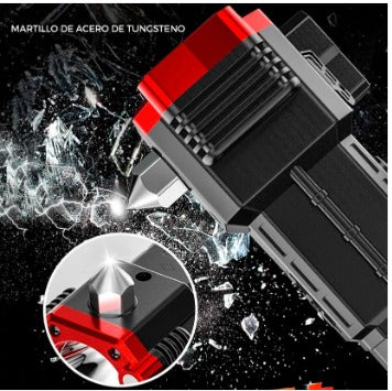 La linterna incluye rompe vidrios y corta cinturones, ideales en emergencias de carretera.